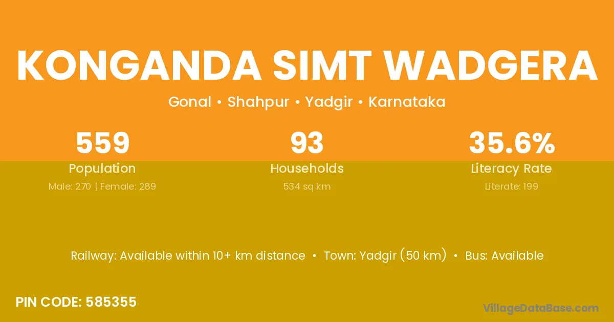 Konganda Simt Wadgera village has a total population of 559 people, of which 270 are males and 289 are females.