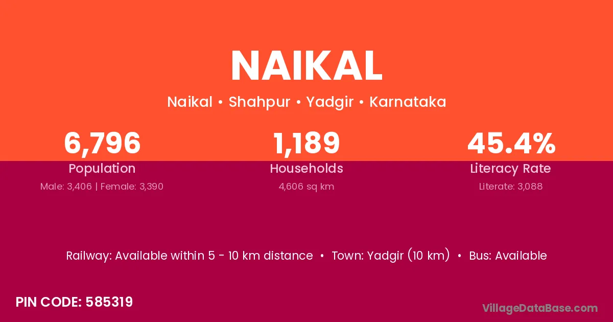 Yadgir (10 km) is the nearest town to Naikal village for major economic activities and is located approximately 10 km away.