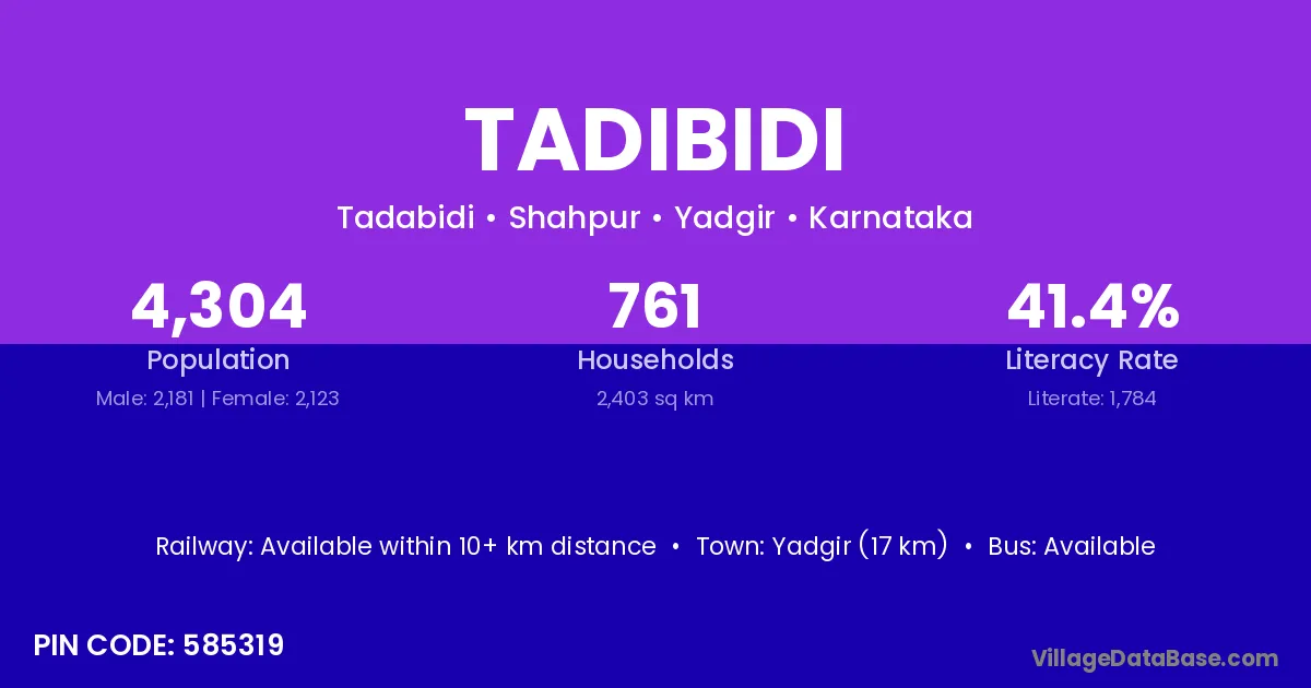Yadgir (17 km) is the nearest town to Tadibidi village for major economic activities and is located approximately 17 km away.