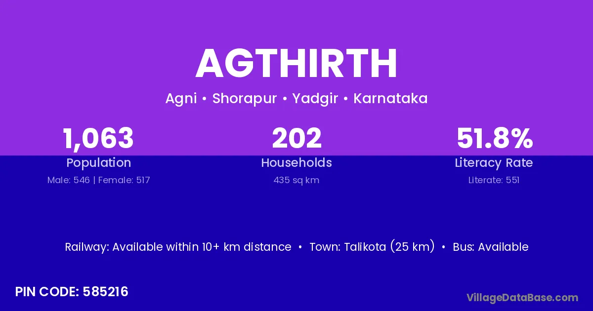 Talikota (25 km) is the nearest town to Agthirth village for major economic activities and is located approximately 25 km away.