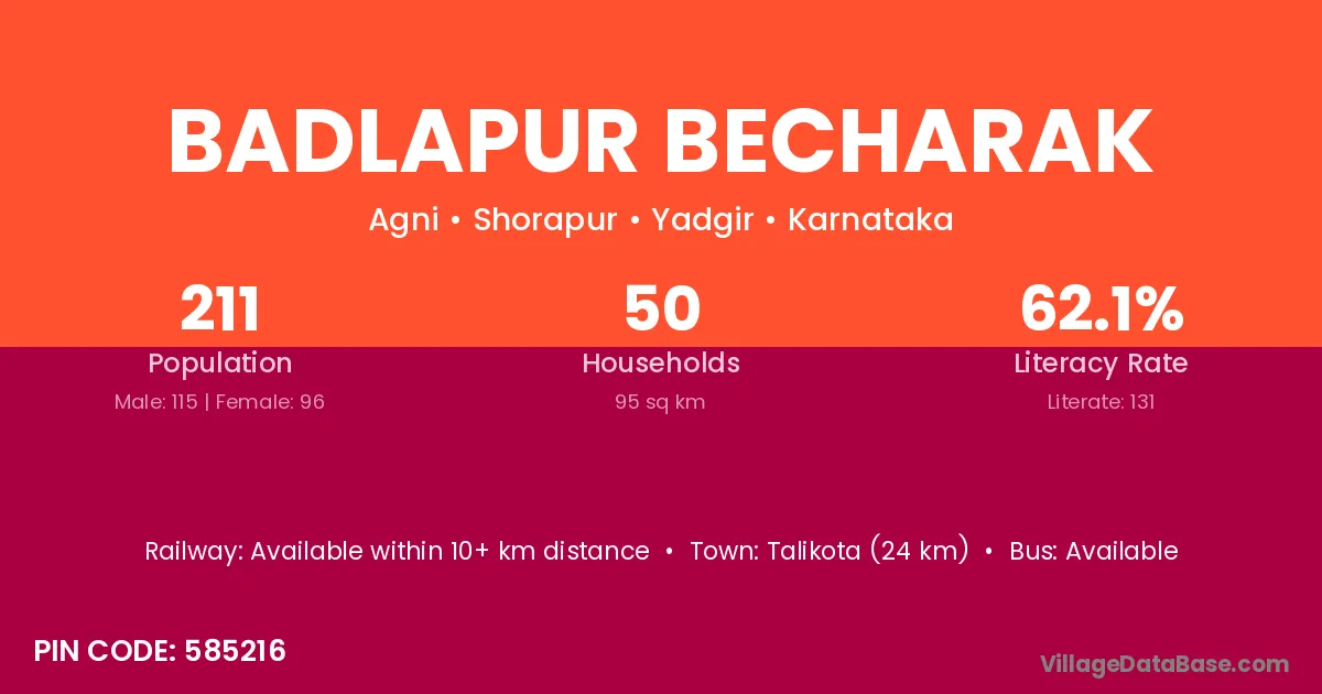 Talikota (24 km) is the nearest town to Badlapur Becharak village for major economic activities and is located approximately 24 km away.
