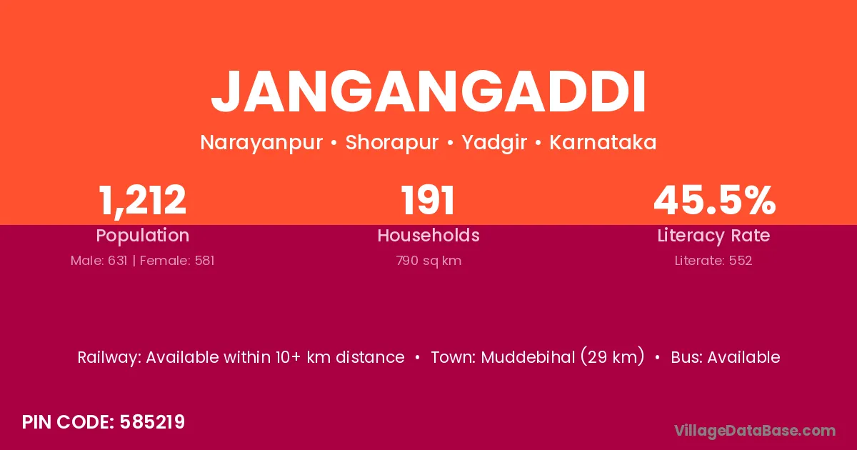 Jangangaddi village has a total population of 1,212 people, of which 631 are males and 581 are females.