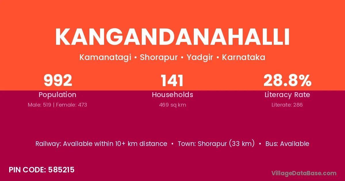 Shorapur (33 km) is the nearest town to Kangandanahalli village for major economic activities and is located approximately 33 km away.