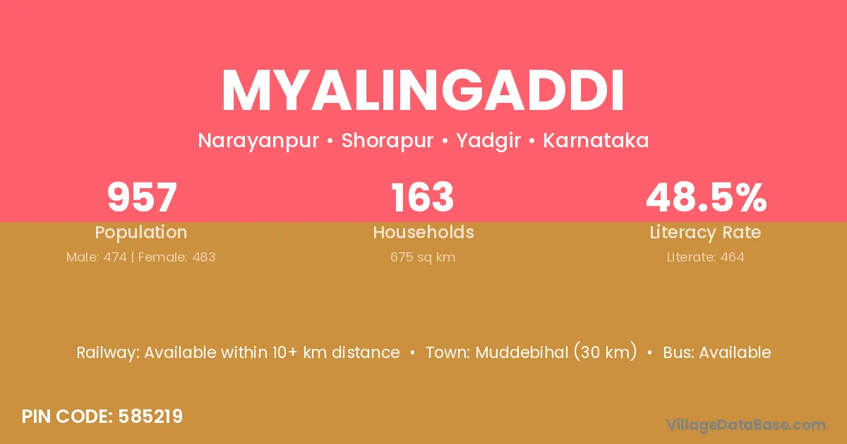 Myalingaddi village has a total population of 957 people, of which 474 are males and 483 are females.