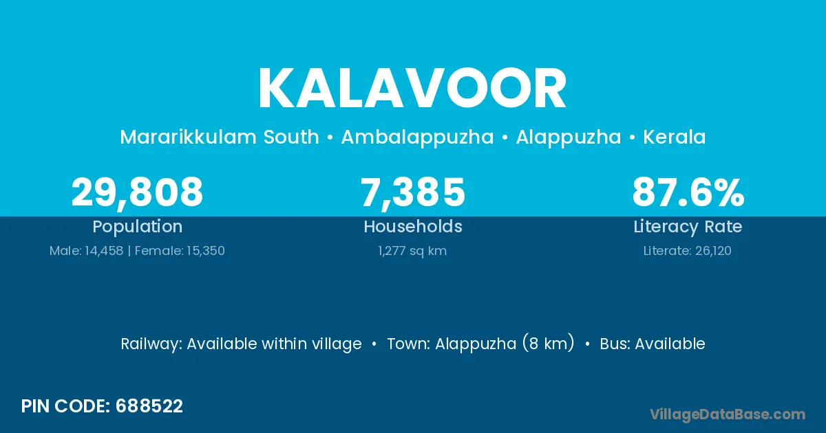 Alappuzha (8 km) is the nearest town to Kalavoor village for major economic activities and is located approximately 8 km away.