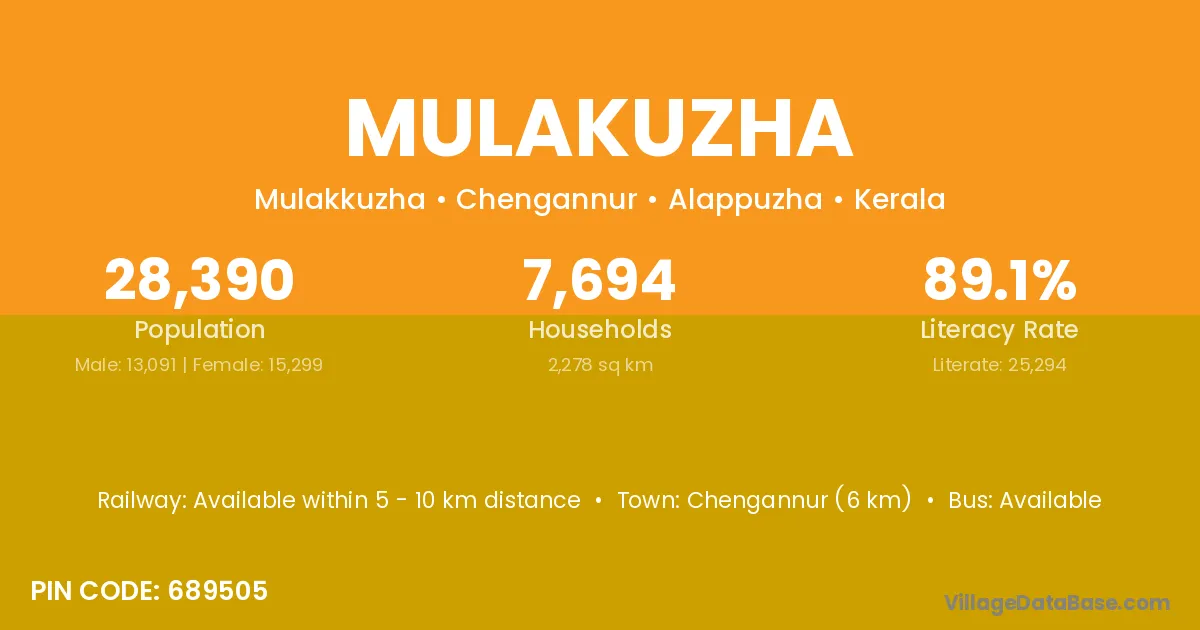 Chengannur (6 km) is the nearest town to Mulakuzha village for major economic activities and is located approximately 6 km away.