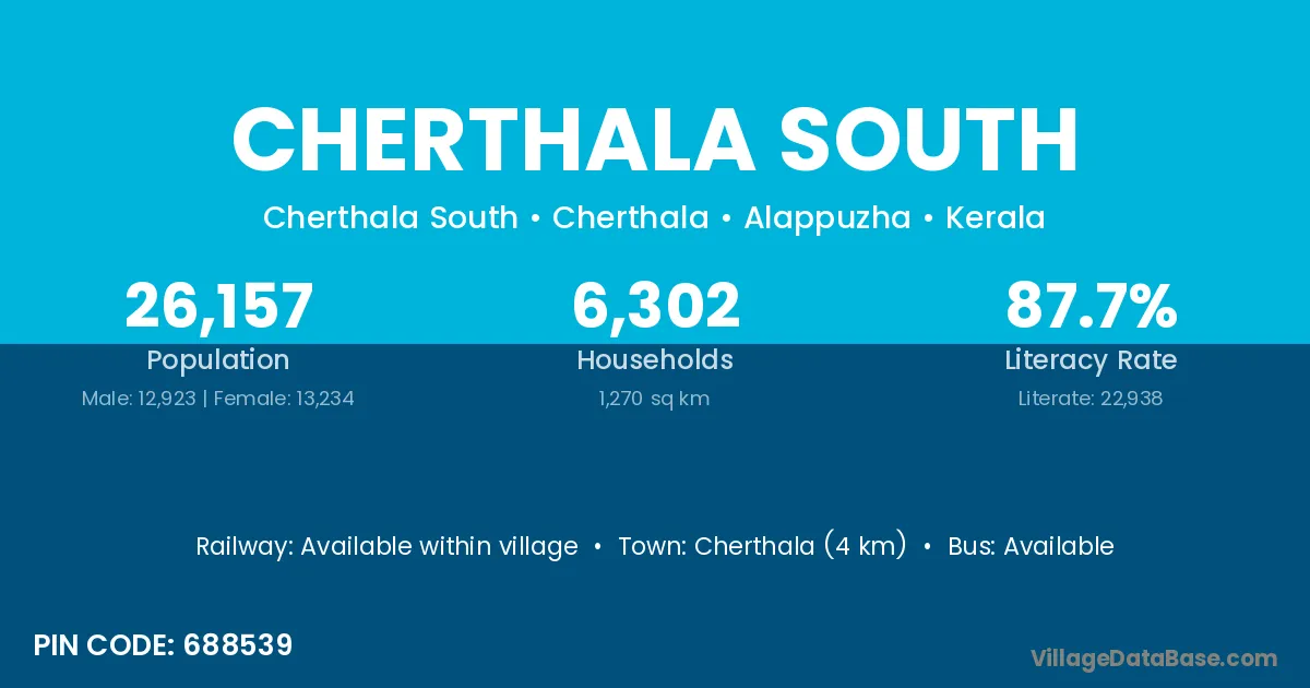 Cherthala South village has a total population of 26,157 people, of which 12,923 are males and 13,234 are females.