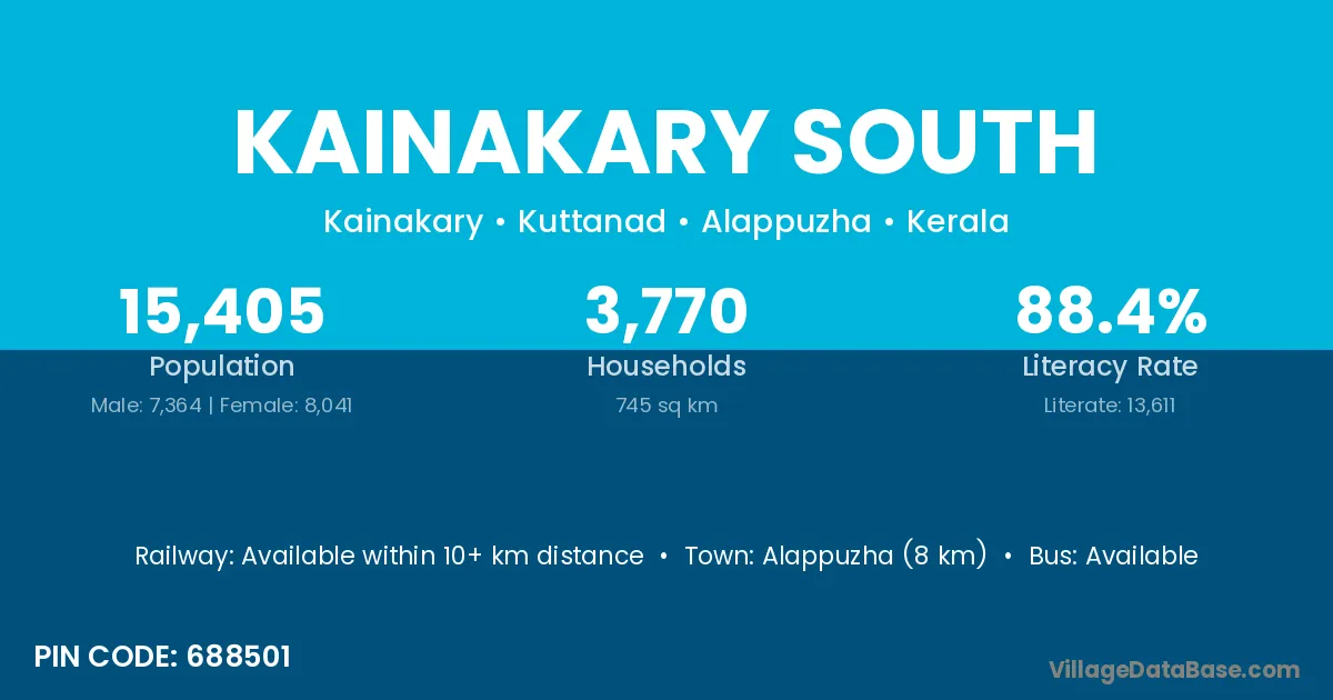 Alappuzha (8 km) is the nearest town to Kainakary South village for major economic activities and is located approximately 8 km away.