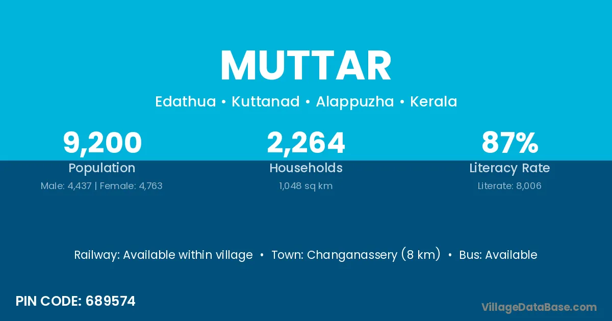 Changanassery (8 km) is the nearest town to Muttar village for major economic activities and is located approximately 8 km away.