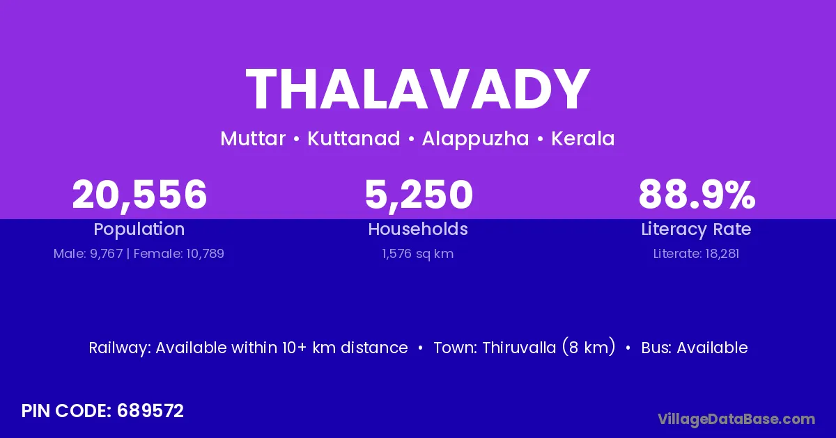 Thiruvalla (8 km) is the nearest town to Thalavady village for major economic activities and is located approximately 8 km away.