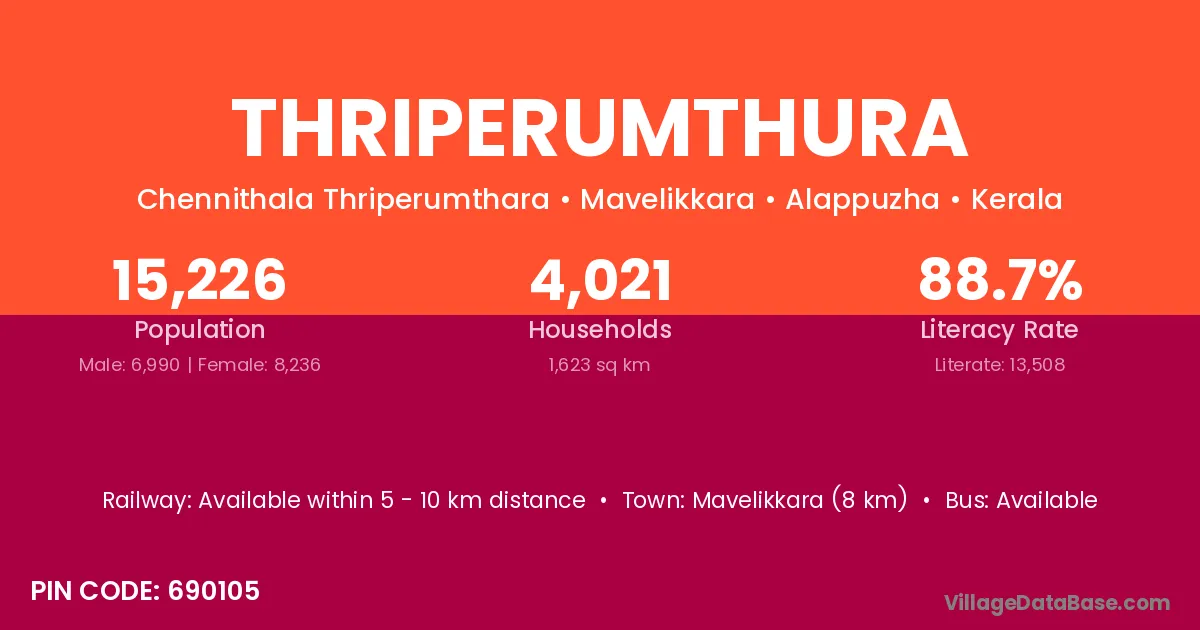 Thriperumthura village has a total population of 15,226 people, of which 6,990 are males and 8,236 are females.