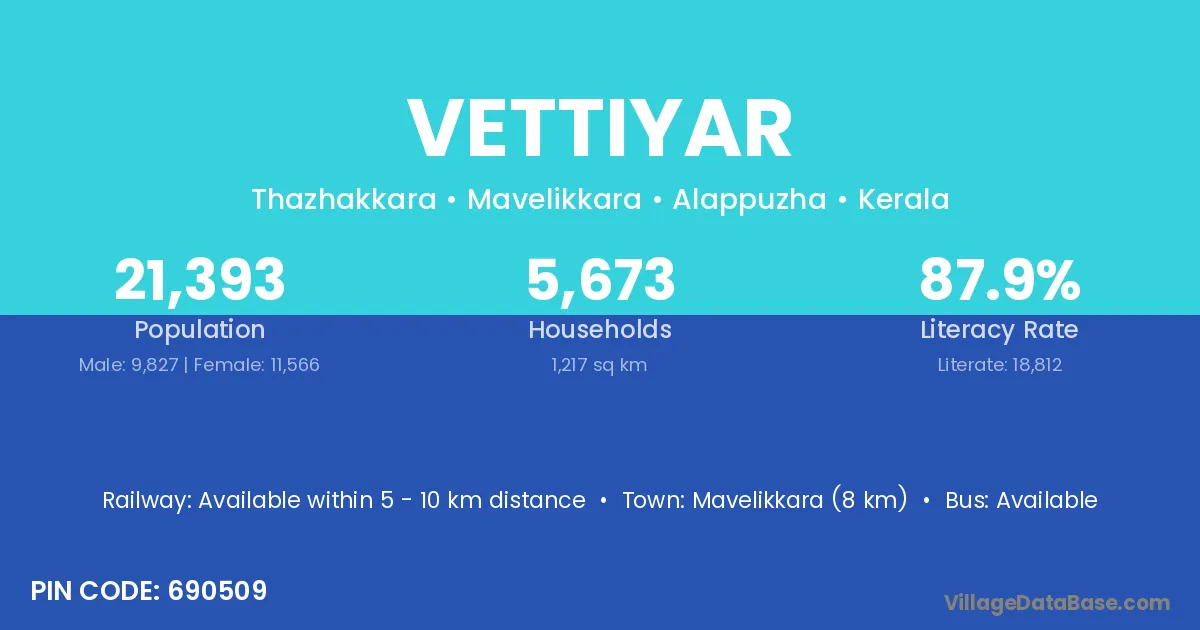 Mavelikkara (8 km) is the nearest town to Vettiyar village for major economic activities and is located approximately 8 km away.