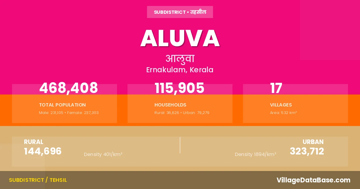 According to the 2011 census The total area of Aluva Taluka is 532 km², with a population of 468408 people. The population density is 881 inhabitants per square kilometre, and there are approximately 115905 houses in the sub district.