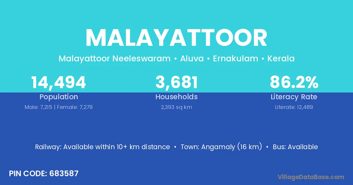 Angamaly (16 km) is the nearest town to Malayattoor village for major economic activities and is located approximately 16 km away.