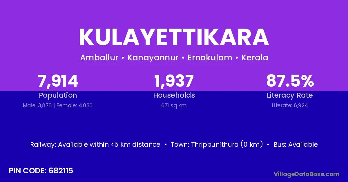Thrippunithura (0 km) is the nearest town to Kulayettikara village for major economic activities