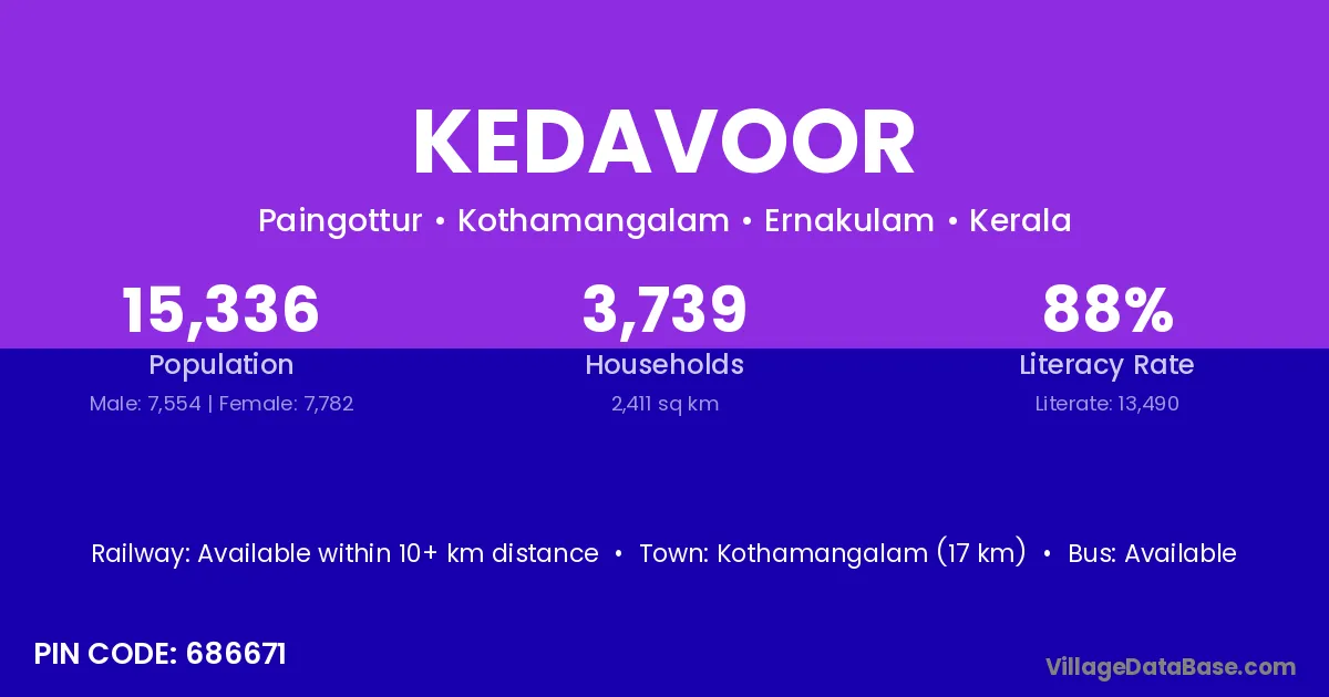 Kothamangalam (17 km) is the nearest town to Kedavoor village for major economic activities and is located approximately 17 km away.