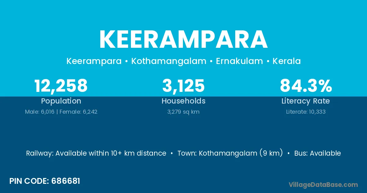 Keerampara village has a total population of 12,258 people, of which 6,016 are males and 6,242 are females.