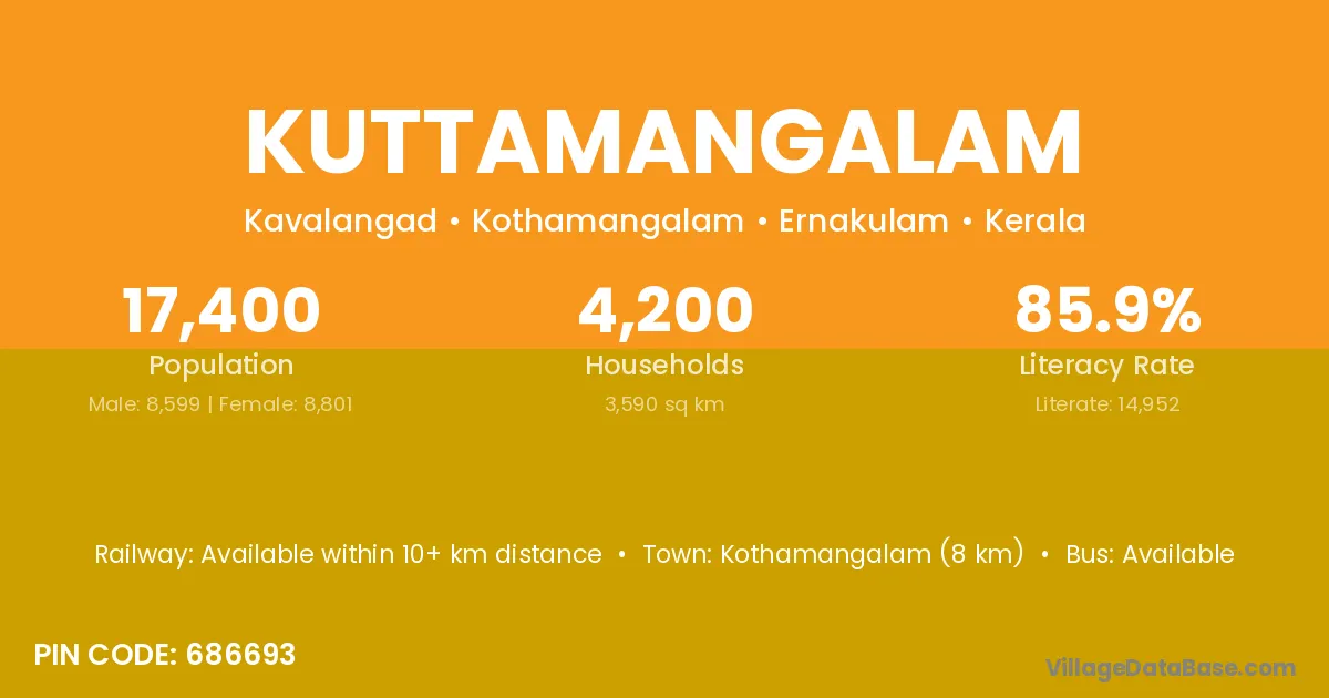 Kuttamangalam village has a total population of 17,400 people, of which 8,599 are males and 8,801 are females.