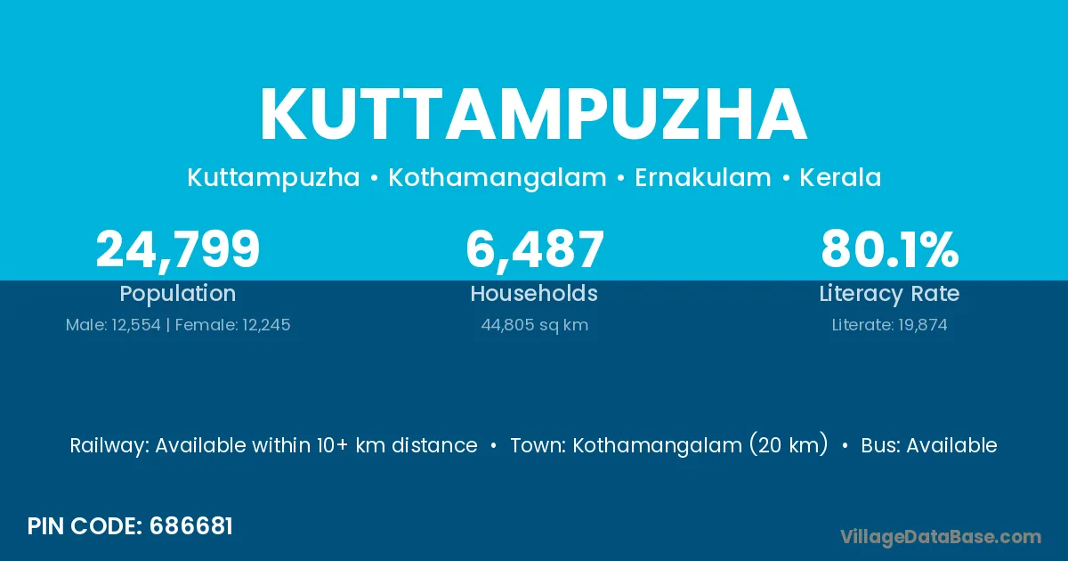 Kothamangalam (20 km) is the nearest town to Kuttampuzha village for major economic activities and is located approximately 20 km away.