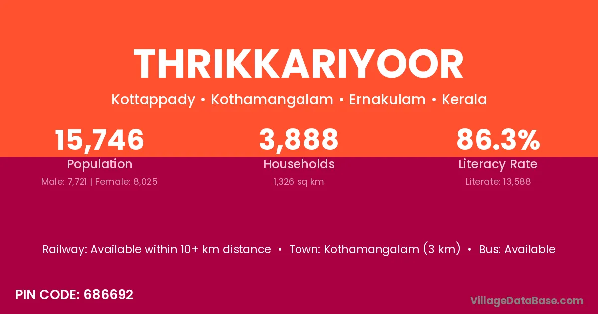 Kothamangalam (3 km) is the nearest town to Thrikkariyoor village for major economic activities and is located approximately 3 km away.