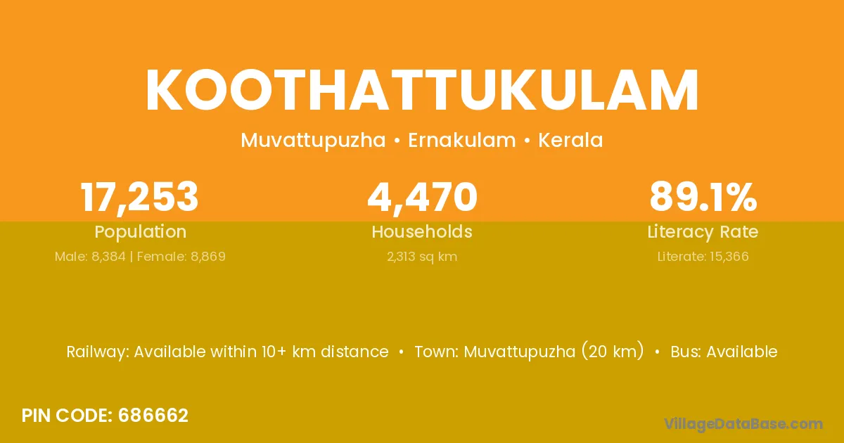 Koothattukulam village has a total population of 17,253 people, of which 8,384 are males and 8,869 are females.