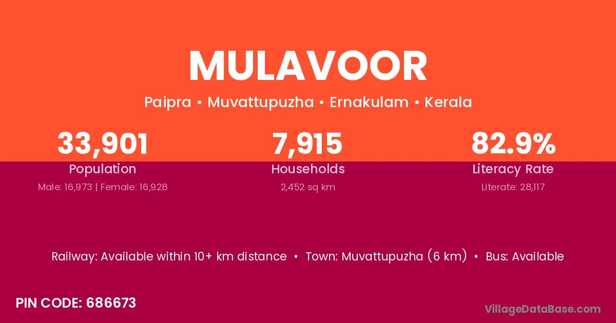Mulavoor village has a total population of 33,901 people, of which 16,973 are males and 16,928 are females.