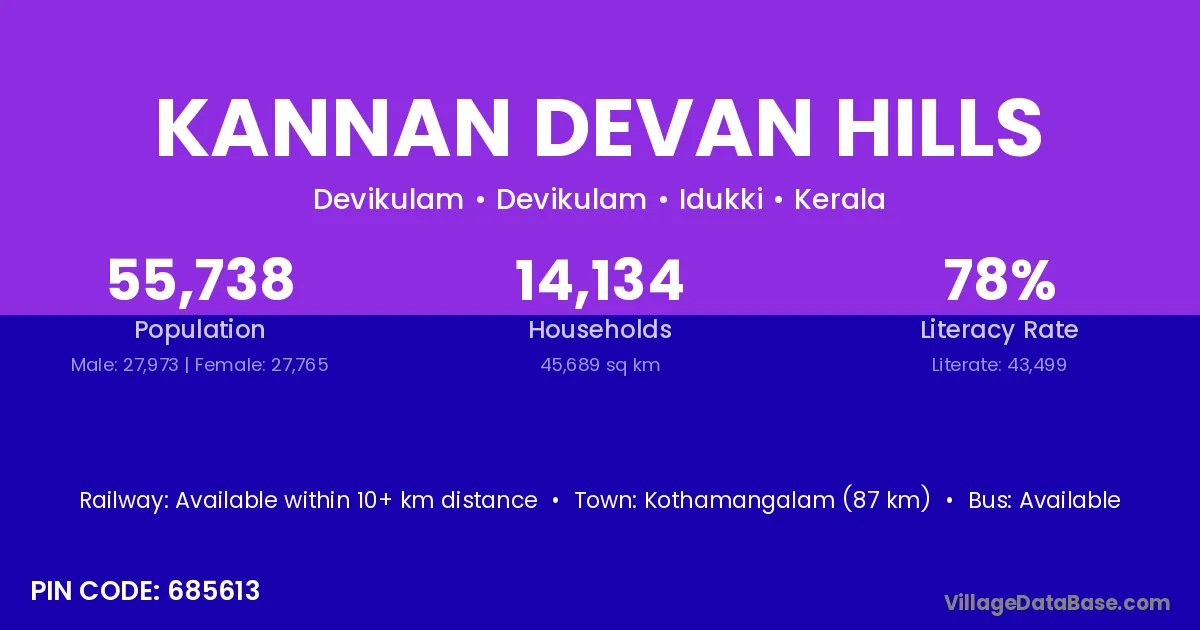 Kannan Devan Hills village has a total population of 55,738 people, of which 27,973 are males and 27,765 are females.