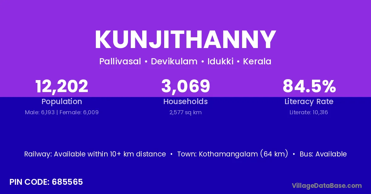 Kunjithanny village has a total population of 12,202 people, of which 6,193 are males and 6,009 are females.