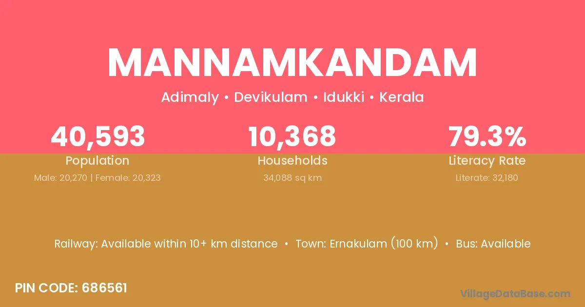 Ernakulam (100 km) is the nearest town to Mannamkandam village for major economic activities and is located approximately 100 km away.