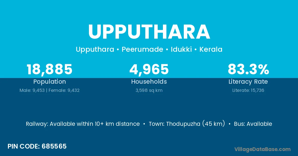 Thodupuzha (45 km) is the nearest town to Upputhara village for major economic activities and is located approximately 45 km away.