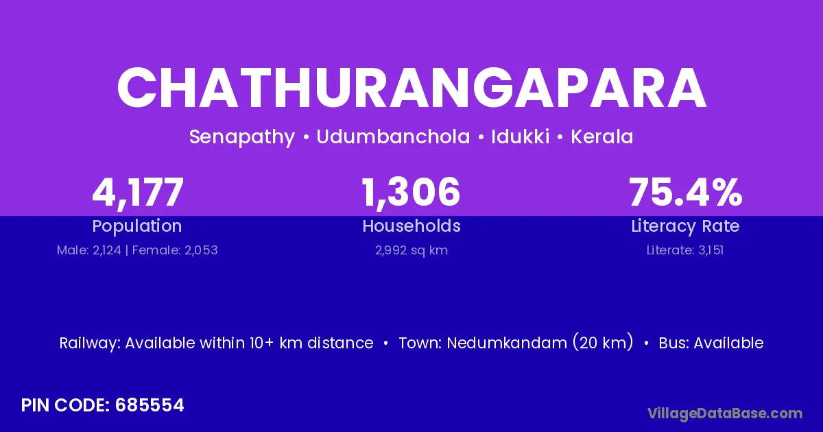 Nedumkandam (20 km) is the nearest town to Chathurangapara village for major economic activities and is located approximately 20 km away.
