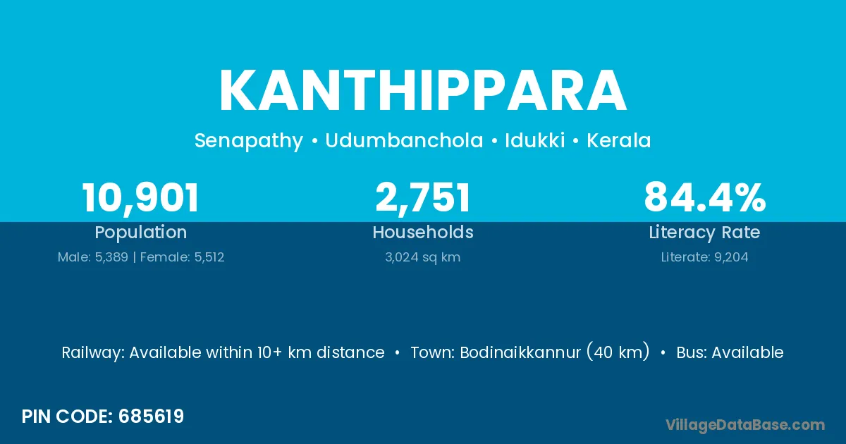 Bodinaikkannur (40 km) is the nearest town to Kanthippara village for major economic activities and is located approximately 40 km away.