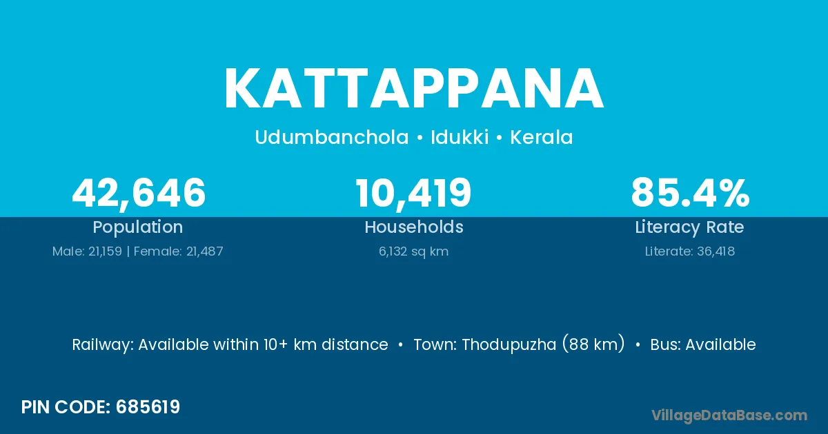 Thodupuzha (88 km) is the nearest town to Kattappana village for major economic activities and is located approximately 88 km away.