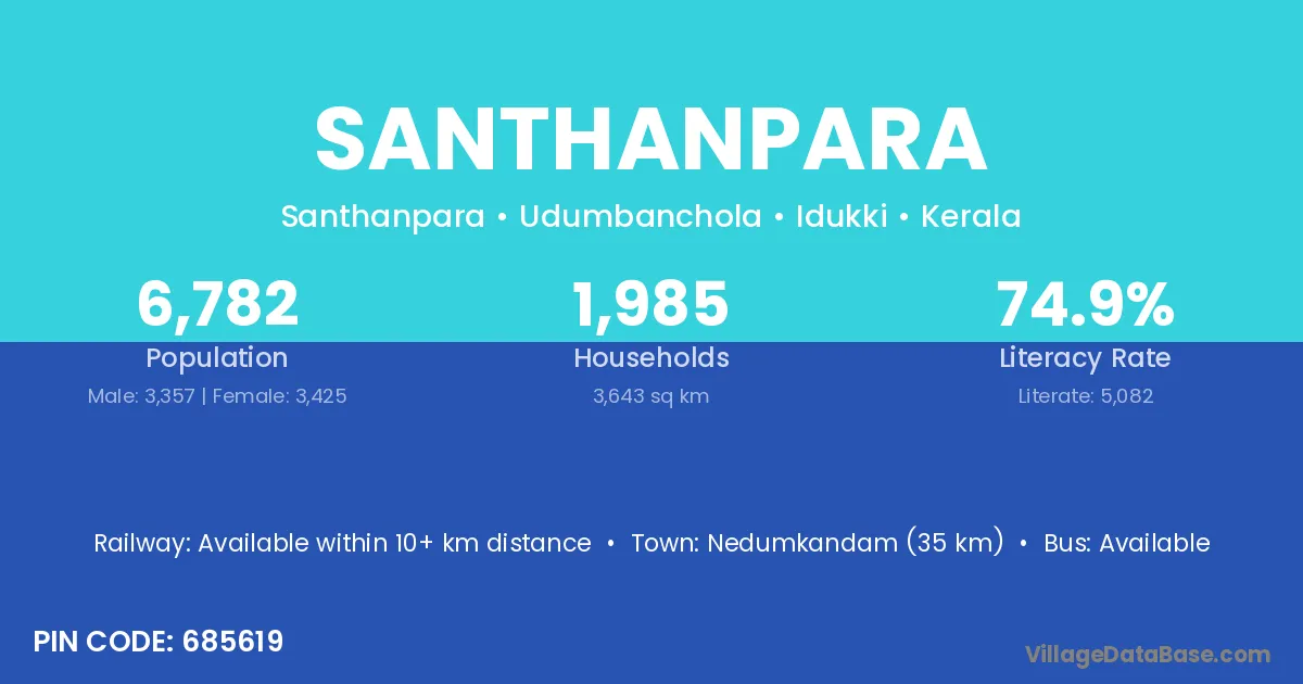 Nedumkandam (35 km) is the nearest town to Santhanpara village for major economic activities and is located approximately 35 km away.
