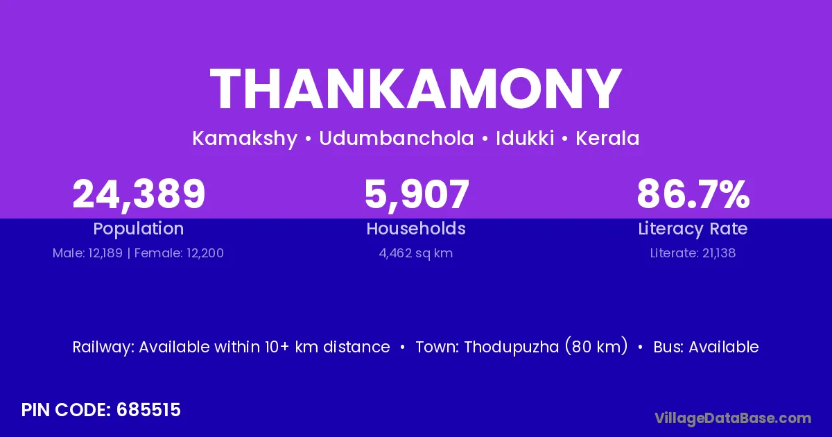 Thodupuzha (80 km) is the nearest town to Thankamony village for major economic activities and is located approximately 80 km away.