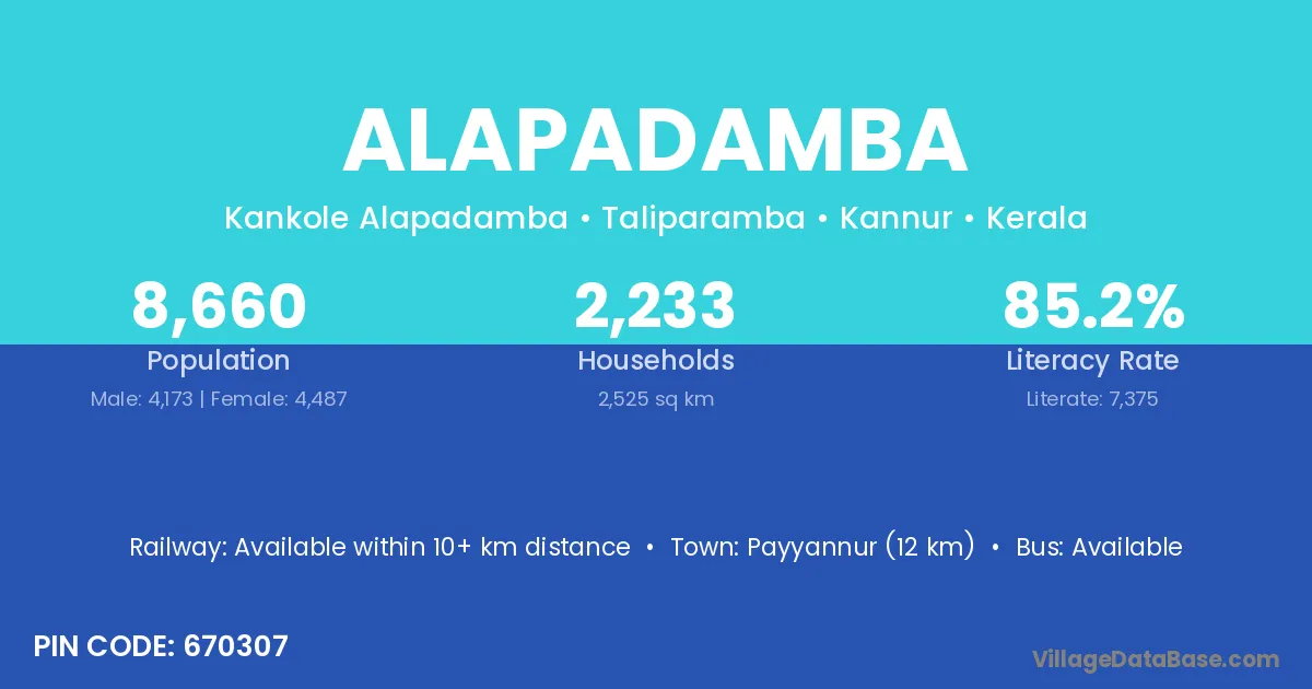 Payyannur (12 km) is the nearest town to Alapadamba village for major economic activities and is located approximately 12 km away.