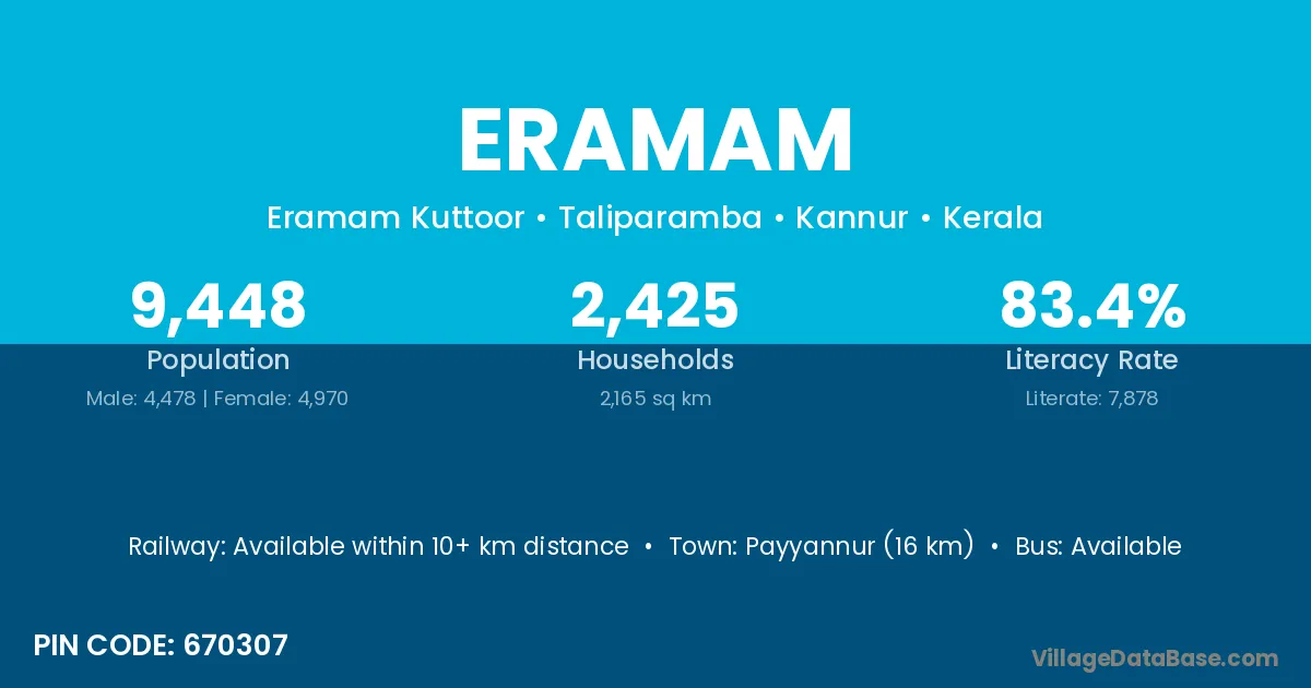 Payyannur (16 km) is the nearest town to Eramam village for major economic activities and is located approximately 16 km away.