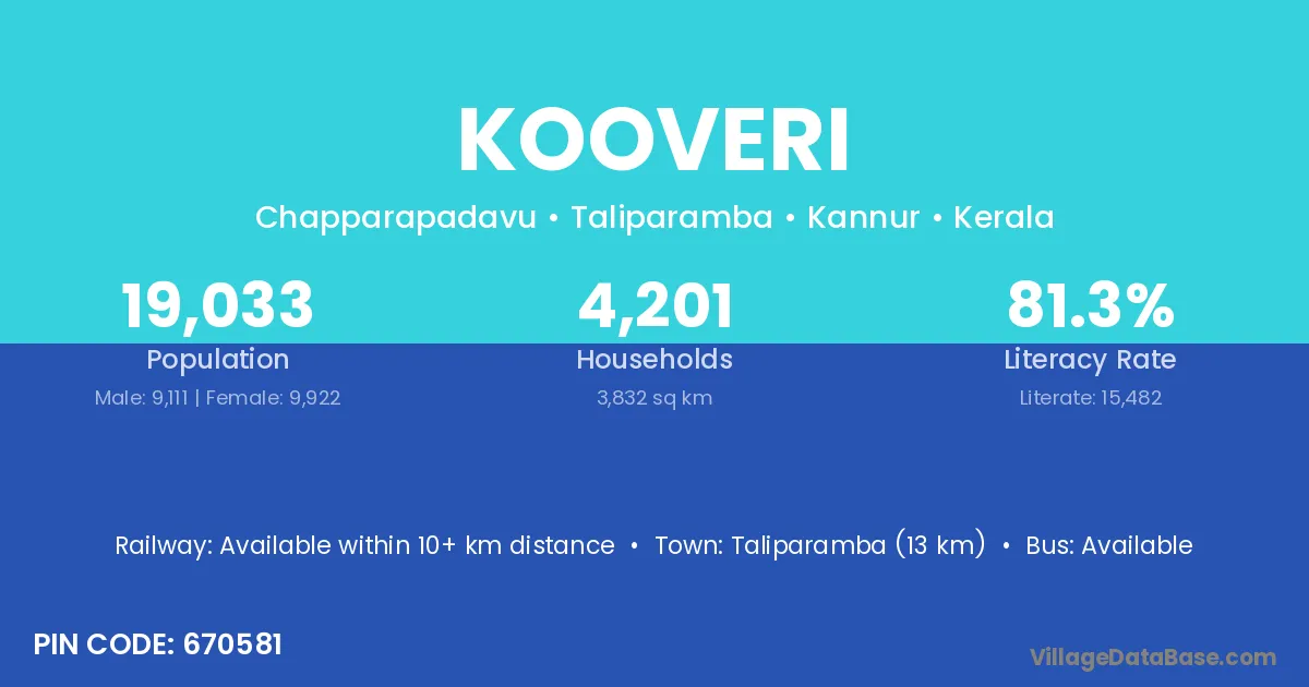 Taliparamba (13 km) is the nearest town to Kooveri village for major economic activities and is located approximately 13 km away.