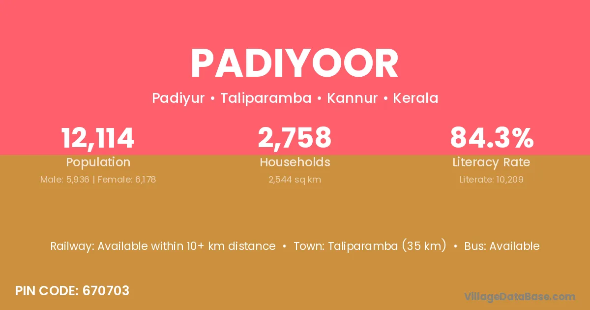 Taliparamba (35 km) is the nearest town to Padiyoor village for major economic activities and is located approximately 35 km away.