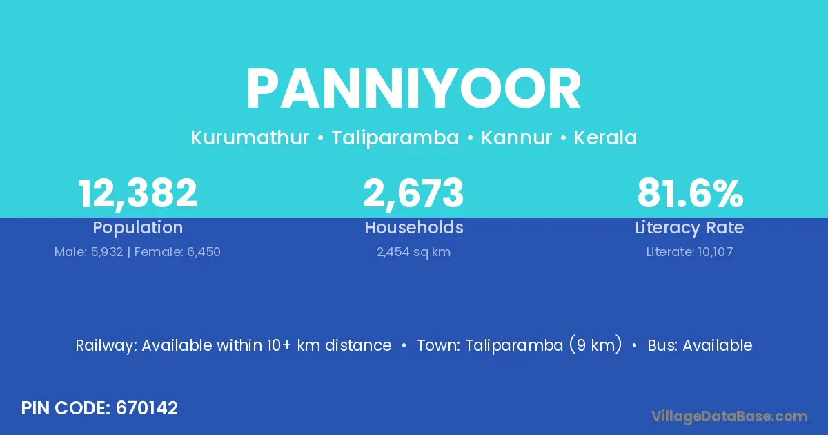 Taliparamba (9 km) is the nearest town to Panniyoor village for major economic activities and is located approximately 9 km away.