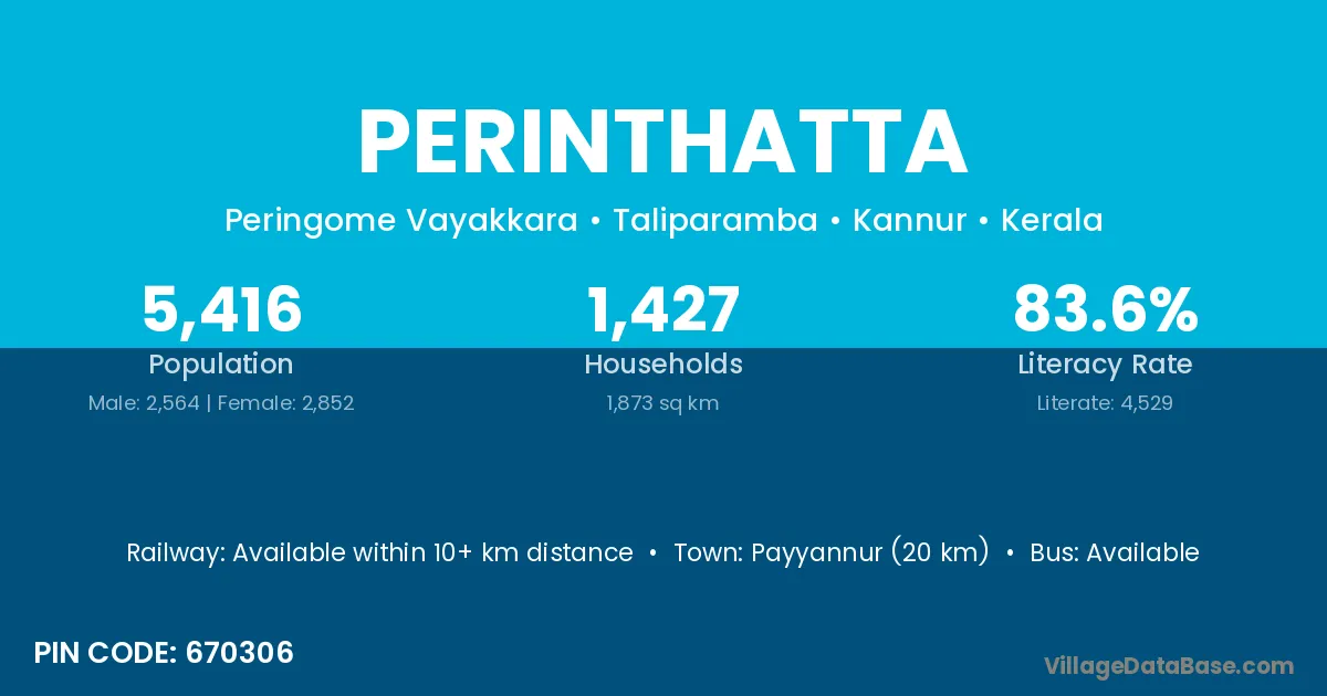The literacy rate of Perinthatta village is 83.62%. Male literacy stands at 86.39% and female literacy at 81.14%.