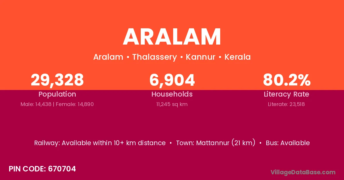 Aralam village has a total population of 29,328 people, of which 14,438 are males and 14,890 are females.