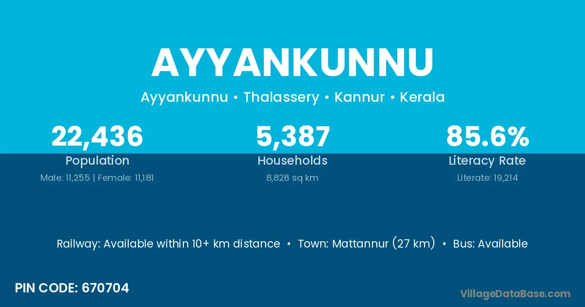 Ayyankunnu village has a total population of 22,436 people, of which 11,255 are males and 11,181 are females.
