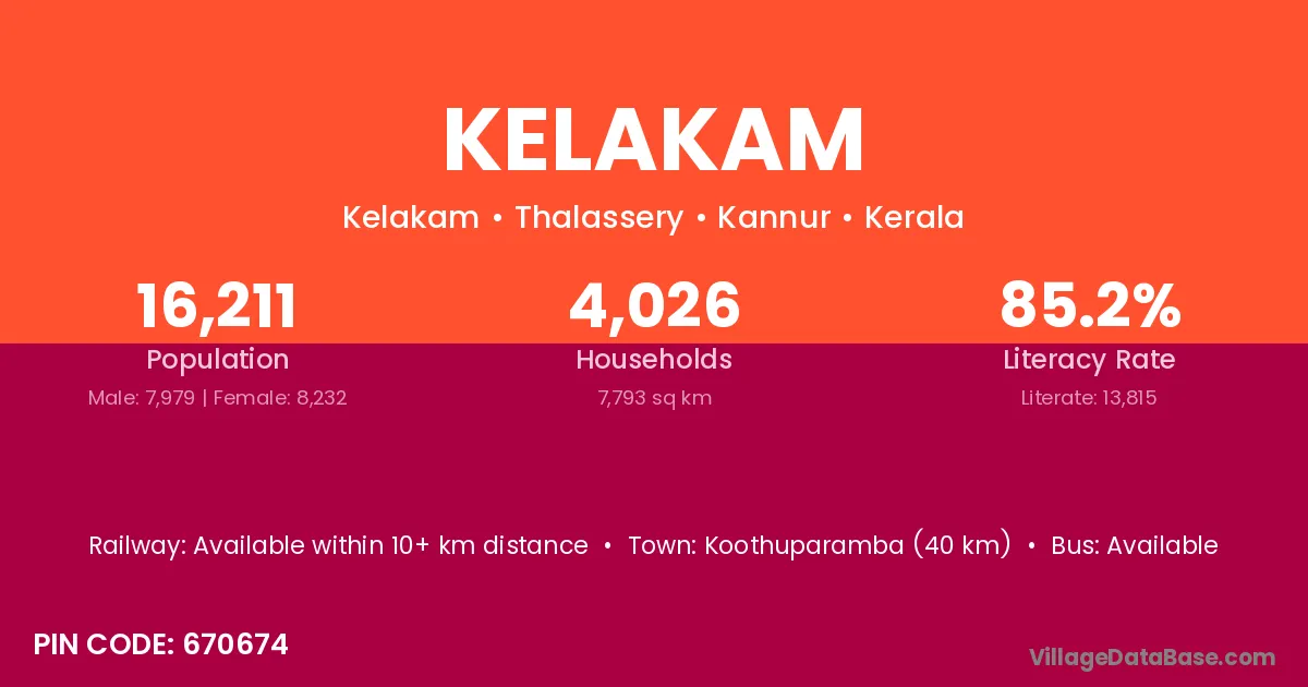 Koothuparamba (40 km) is the nearest town to Kelakam village for major economic activities and is located approximately 40 km away.