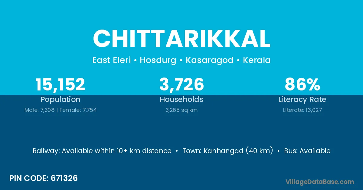 Chittarikkal village has a total population of 15,152 people, of which 7,398 are males and 7,754 are females.