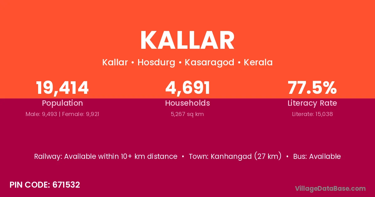 Kanhangad (27 km) is the nearest town to Kallar village for major economic activities and is located approximately 27 km away.