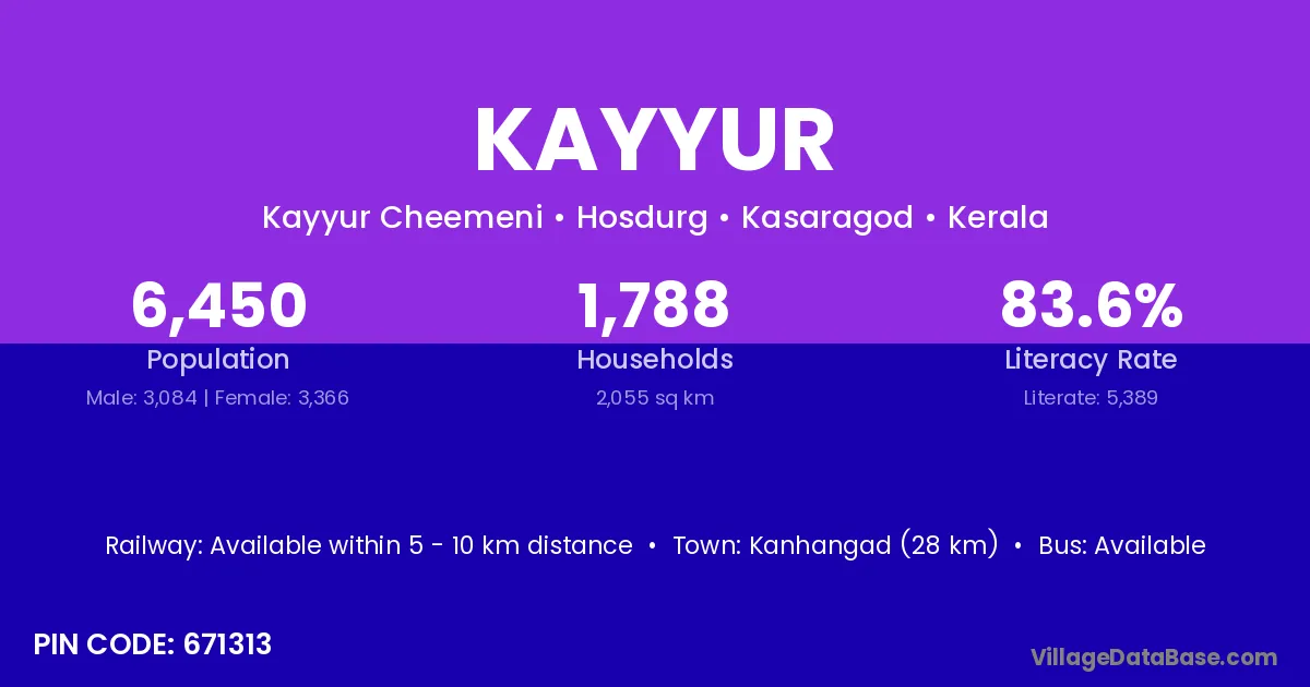 Kayyur village has a total population of 6,450 people, of which 3,084 are males and 3,366 are females.