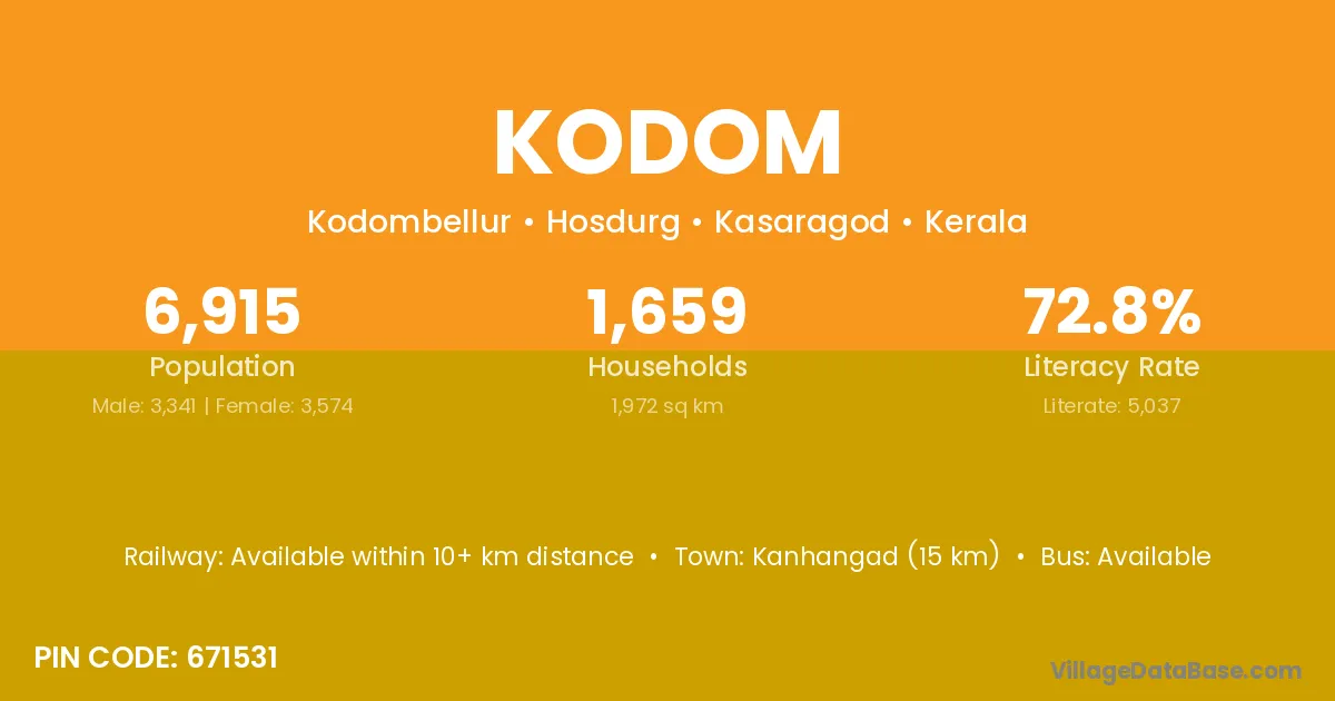 Kanhangad (15 km) is the nearest town to Kodom village for major economic activities and is located approximately 15 km away.
