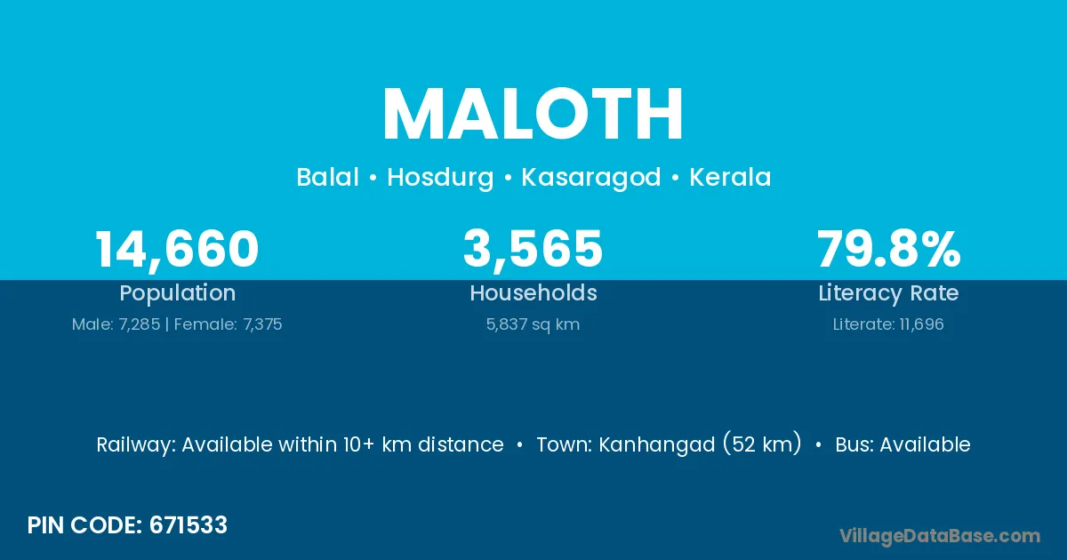 Kanhangad (52 km) is the nearest town to Maloth village for major economic activities and is located approximately 52 km away.