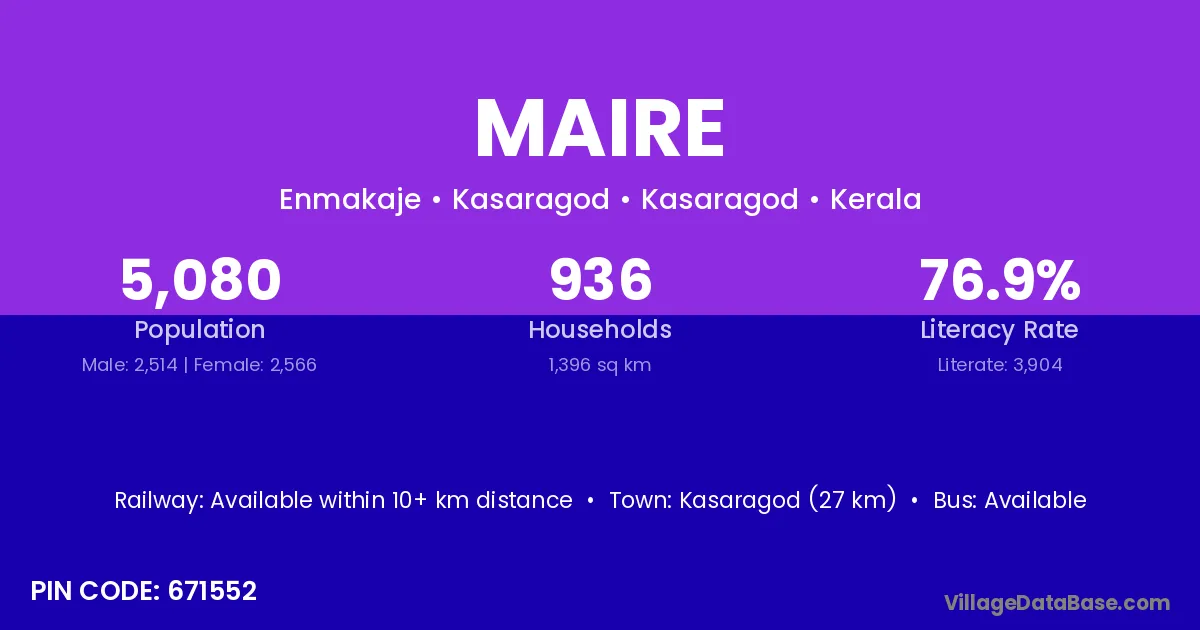 Kasaragod (27 km) is the nearest town to Maire village for major economic activities and is located approximately 27 km away.